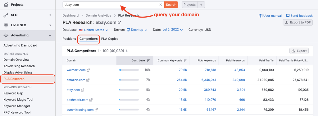 By entering a competitor’s website into Semrush’s Domain Analytics Tool, you can see which keywords they are ranking for and how their pages are performing. This provides valuable insights into your competitors’ strategies, allowing you to adjust your approach for better results. Keyword gaps identified through competitor analysis are a prime opportunity for SEO improvements.