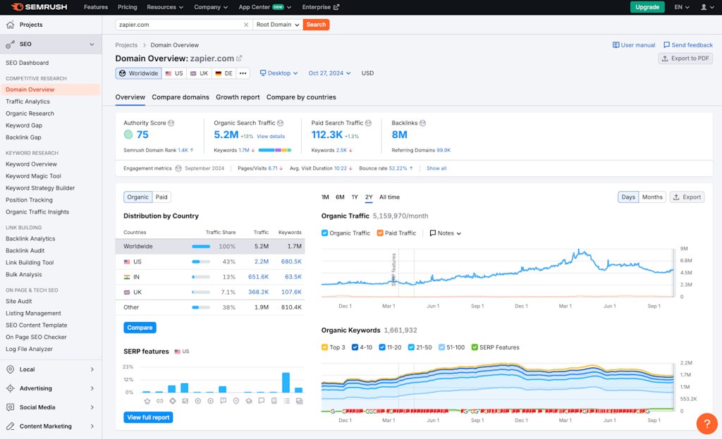 Semrush’s suite of tools offers valuable insights into keyword research, site audits, competitor analysis, backlink tracking, and much more. Using Semrush for SEO means you can make data-driven decisions to increase rankings, optimize content, and maximize your online presence.